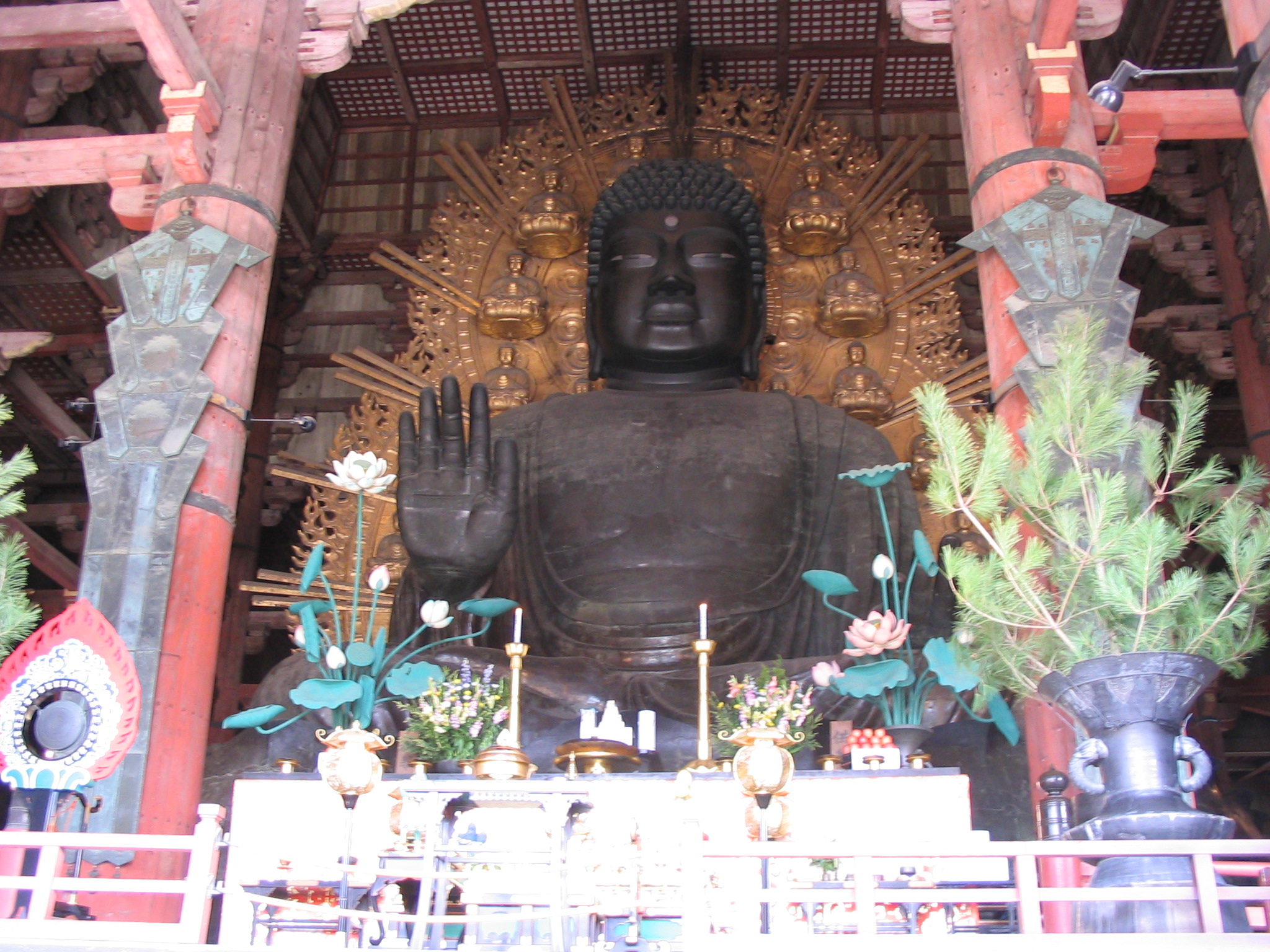 Like many temples in Japan, the original Hall burned down many times.  The current hall was finished In 1709, Great Buddha Hall, Daibutsuden, which houses the Daibutsu.  Bizarrely, it’s actually 1/3 smaller than the wooden building it replaced.  Even so, until the turn of the 20th Century it was still the world’s largest wooden building.  And like the temple, the statue itself has been repaired and redone many times over the years due to fire and earthquake damage, plus wars.