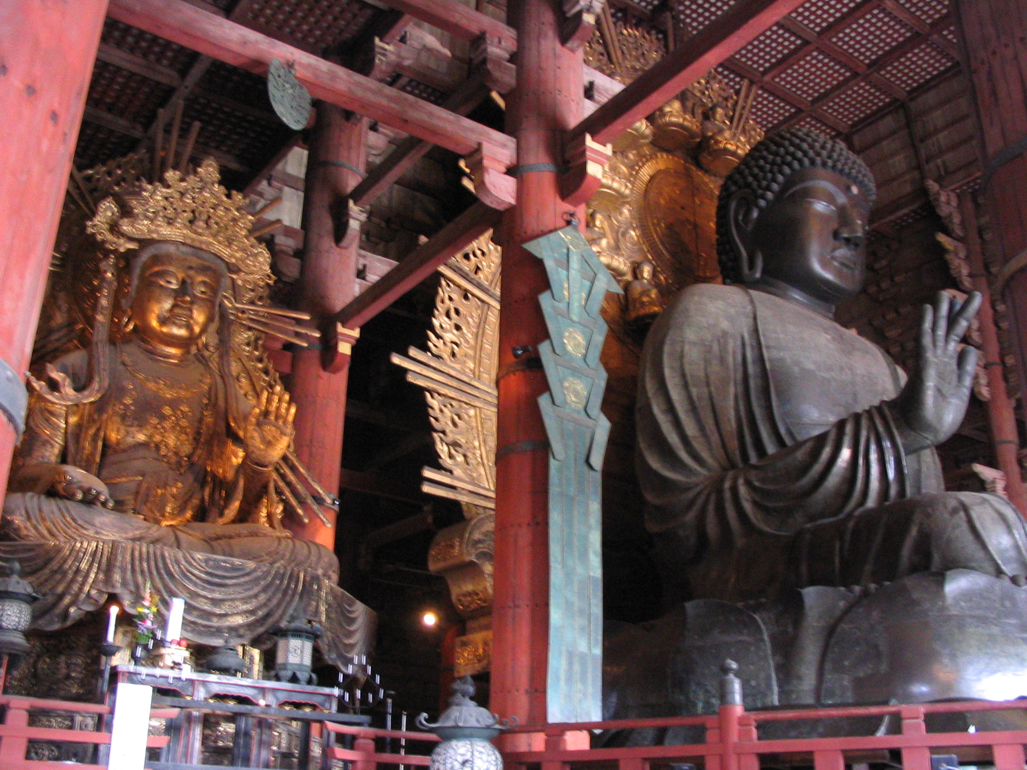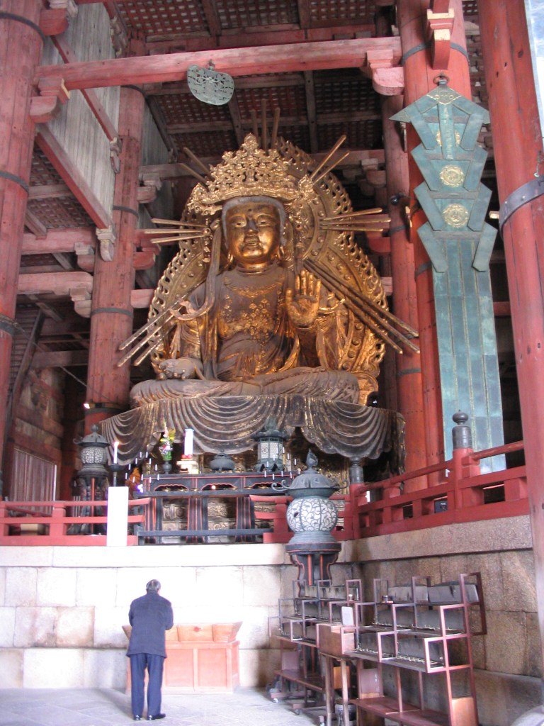 Originally the site was a 8th Century temple built by Emperor Shomu to honor his infant son’s death.  This is when Nara was Japan’s capital, though the country was not totally united during this era.  The larger temple, and chiefly the Daibutsu came later, between 738-752.  It seems (by legend) that in order to finance such a grand undertaking Shomu had to cut a deal.  The Buddhist monk Gyoki would help, but only if he was allowed to teach Buddhism to the people.  This was part of a very complicated transition in Japanese religion where traditional Shinto beliefs began to evolve alongside Buddhism and they merged into a very unique Japanese version of both religions.